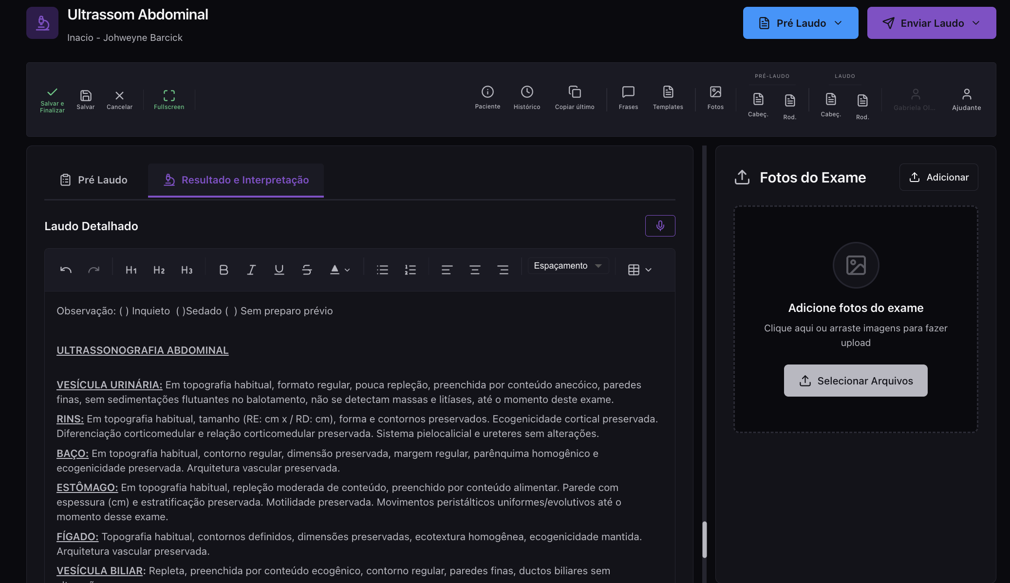 Escreva laudos com editor rico: formatação, tabelas, imagens, links e assinatura digital. Use templates prontos por tipo de exame e um banco de frases salvas para agilizar a escrita. Cada laudo tem cabeçalho e rodapé personalizados com a identidade visual da sua empresa.