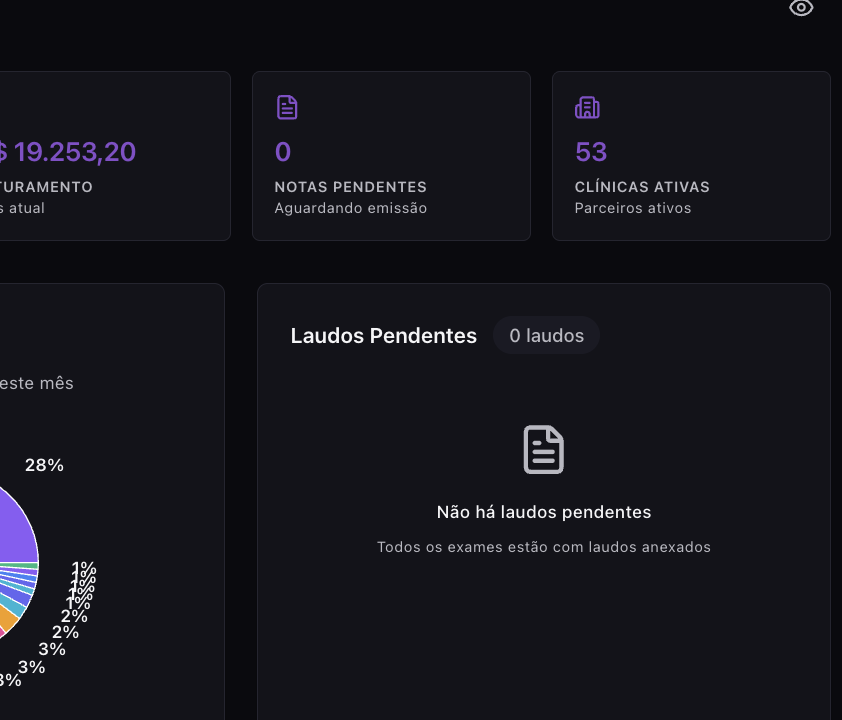 Acompanhe o faturamento mensal, gere faturas para clínicas parceiras, registre despesas e consulte relatórios detalhados